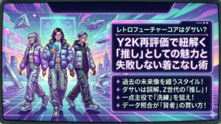 ファッション レトロフューチャーコアはダサい?Y2K再評価で紐解く「推し」としての魅力と失敗しない着こなし術 古着購入で失敗したくない女子必見!メルカリでの採寸チェックのコツやパタゴニア・リーバイスの本物見分け方、自宅でできる重曹メンテナンス法まで、プロ直伝のテクニックを徹底解説。賢くサステナブルにおしゃれを楽しむための、リユース女子の教科書です✨ 2026.04.17 ファッション